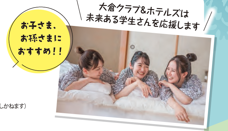 熱意を持って若者の育成にあたる大倉クラブ&ホテルズの「学割キャンペーン」を利用して、ワクワクする旅をお楽しみください。